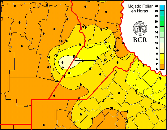 Mapa de cantidad de horas de mojado foliar en las últimas 24 horas.