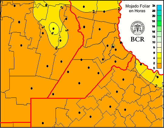 Mapa de cantidad de horas de mojado foliar en las últimas 24 horas.