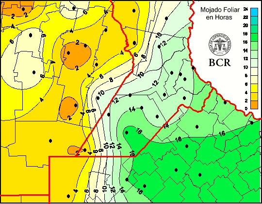 Mapa de cantidad de horas de mojado foliar en las últimas 24 horas.