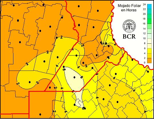 Mapa de cantidad de horas de mojado foliar en las últimas 24 horas.