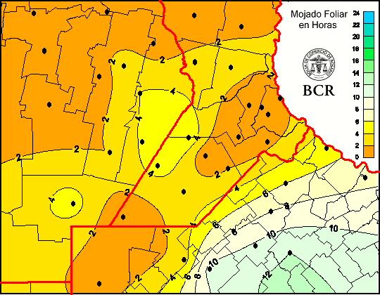 Mapa de cantidad de horas de mojado foliar en las últimas 24 horas.