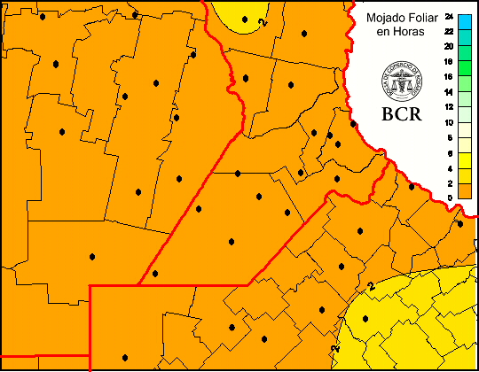 Mapa de cantidad de horas de mojado foliar en las últimas 24 horas.