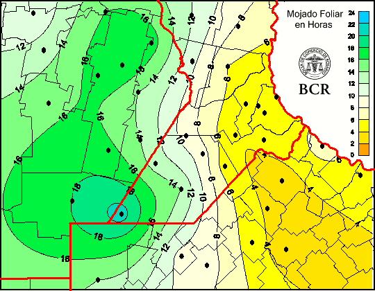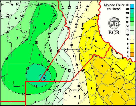Mapa de cantidad de horas de mojado foliar en las últimas 24 horas.