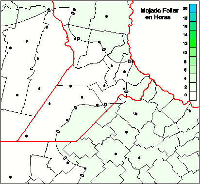 Mapa de humedad de hoja de las las últimas 0 horas.(Desde las 8:00AM hasta las 8:00AM). Se actualiza a las 10:00hs.