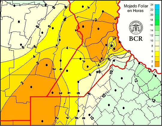Mapa de cantidad de horas de mojado foliar en las últimas 24 horas.