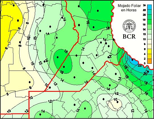 Mapa de cantidad de horas de mojado foliar en las últimas 24 horas.