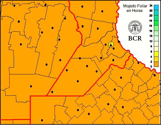 Mapa de cantidad de horas de mojado foliar en las últimas 24 horas.