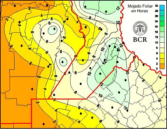 Mapa de cantidad de horas de mojado foliar en las últimas 24 horas.