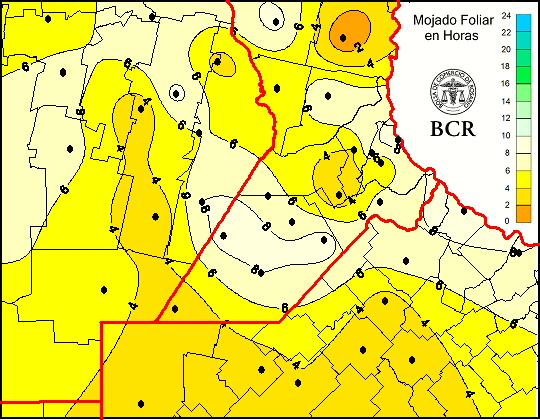 Mapa de cantidad de horas de mojado foliar en las últimas 24 horas.
