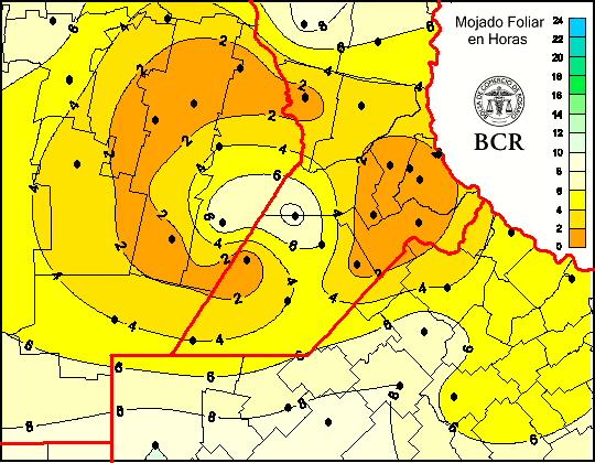 Mapa de cantidad de horas de mojado foliar en las últimas 24 horas.