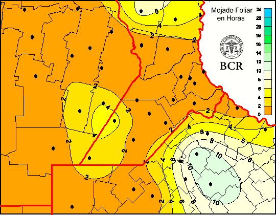 Mapa de cantidad de horas de mojado foliar en las últimas 24 horas.