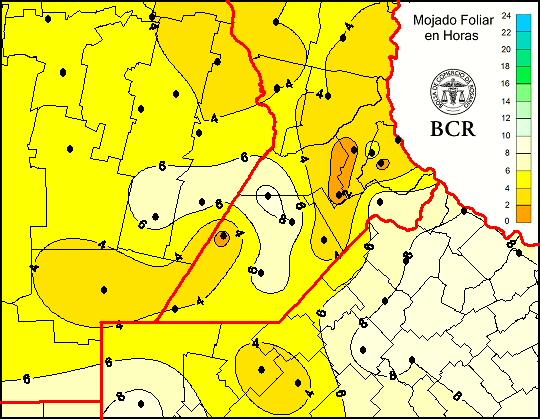 Mapa de cantidad de horas de mojado foliar en las últimas 24 horas.