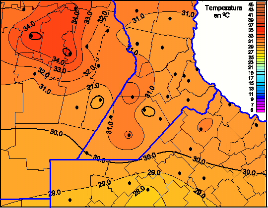 Mapa de temperaturas máximas de las las últimas 96 horas.(Desde las 8:00AM hasta las 8:00AM). Se actualiza a las 10:00hs.