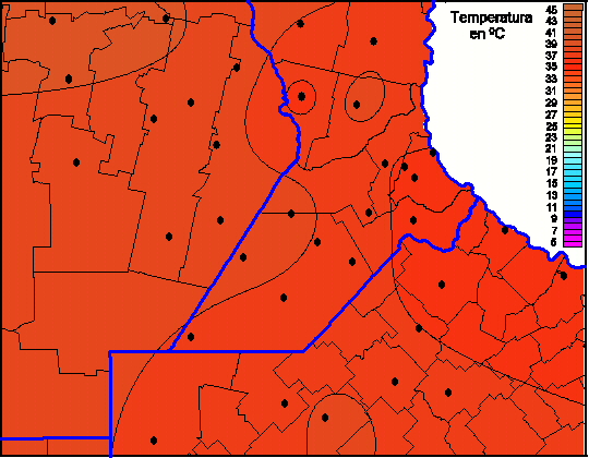 Mapa de temperaturas máximas de las las últimas 72 horas.(Desde las 8:00AM hasta las 8:00AM). Se actualiza a las 10:00hs.