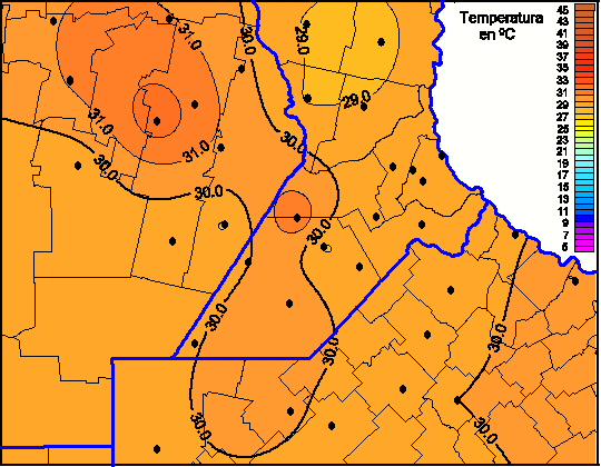 Mapa de temperaturas máximas de las las últimas 72 horas.(Desde las 8:00AM hasta las 8:00AM). Se actualiza a las 10:00hs.