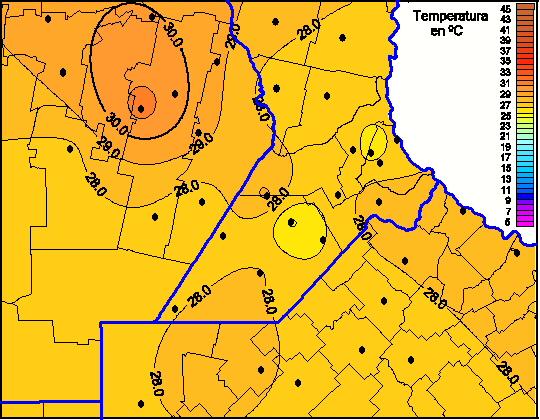 Mapa de temperaturas máximas de las las últimas 72 horas.(Desde las 8:00AM hasta las 8:00AM). Se actualiza a las 10:00hs.