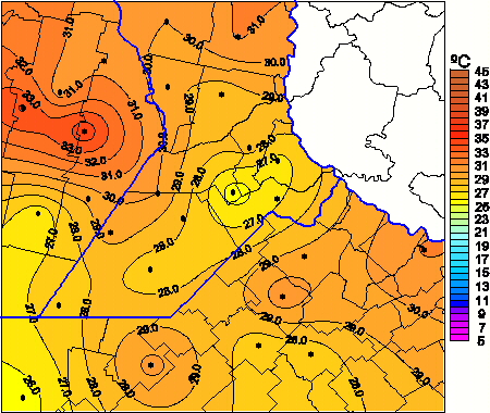 Mapa de temperaturas máximas de las las últimas 72 horas.(Desde las 8:00AM hasta las 8:00AM). Se actualiza a las 10:00hs.
