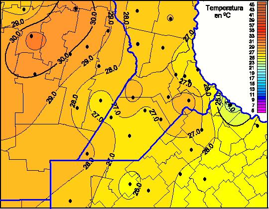Mapa de temperaturas máximas de las las últimas 96 horas.(Desde las 8:00AM hasta las 8:00AM). Se actualiza a las 10:00hs.