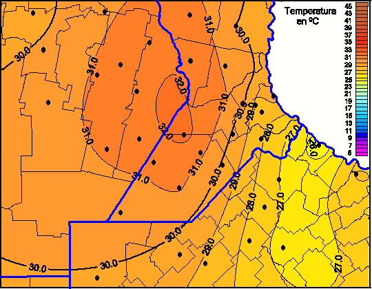 Mapa de temperaturas máximas de las las últimas 96 horas.(Desde las 8:00AM hasta las 8:00AM). Se actualiza a las 10:00hs.