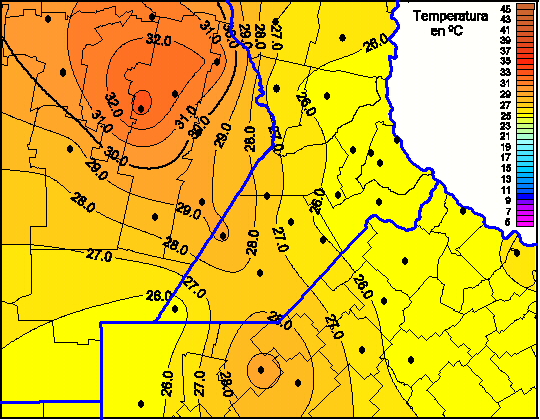 Mapa de temperaturas máximas de las las últimas 72 horas.(Desde las 8:00AM hasta las 8:00AM). Se actualiza a las 10:00hs.
