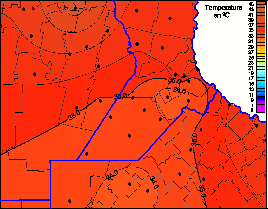 Mapa de temperaturas máximas de las las últimas 72 horas.(Desde las 8:00AM hasta las 8:00AM). Se actualiza a las 10:00hs.