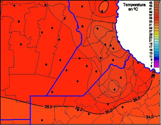 Mapa de temperaturas máximas de las las últimas 72 horas.(Desde las 8:00AM hasta las 8:00AM). Se actualiza a las 10:00hs.
