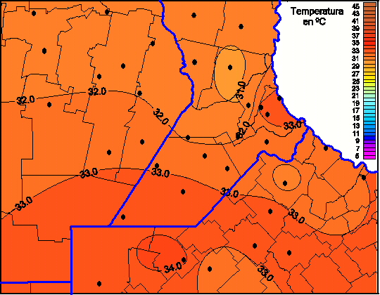 Mapa de temperaturas máximas de las las últimas 72 horas.(Desde las 8:00AM hasta las 8:00AM). Se actualiza a las 10:00hs.