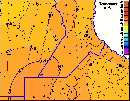 Mapa de temperaturas máximas de las las últimas 72 horas.(Desde las 8:00AM hasta las 8:00AM). Se actualiza a las 10:00hs.