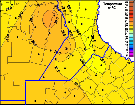 Mapa de temperaturas máximas de las las últimas 96 horas.(Desde las 8:00AM hasta las 8:00AM). Se actualiza a las 10:00hs.