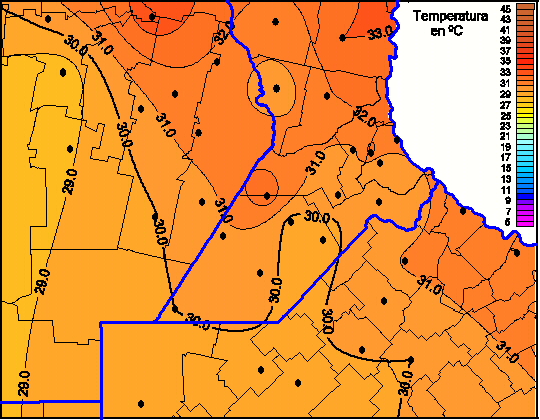 Mapa de temperaturas máximas de las las últimas 72 horas.(Desde las 8:00AM hasta las 8:00AM). Se actualiza a las 10:00hs.