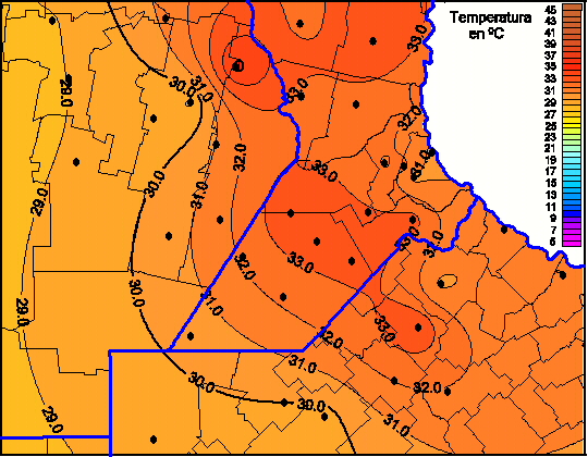 Mapa de temperaturas máximas de las las últimas 72 horas.(Desde las 8:00AM hasta las 8:00AM). Se actualiza a las 10:00hs.