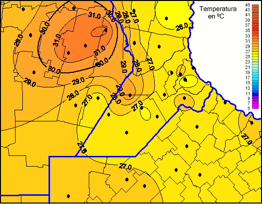 Mapa de temperaturas máximas de las las últimas 96 horas.(Desde las 8:00AM hasta las 8:00AM). Se actualiza a las 10:00hs.