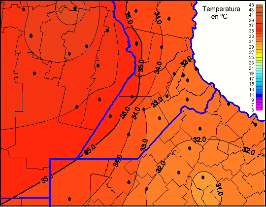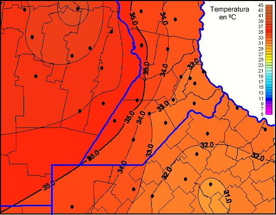 Mapa de temperaturas máximas de las las últimas 72 horas.(Desde las 8:00AM hasta las 8:00AM). Se actualiza a las 10:00hs.