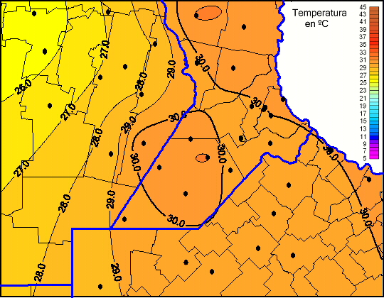 Mapa de temperaturas máximas de las las últimas 96 horas.(Desde las 8:00AM hasta las 8:00AM). Se actualiza a las 10:00hs.