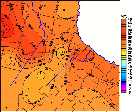 Mapa de temperaturas máximas de las las últimas 96 horas.(Desde las 8:00AM hasta las 8:00AM). Se actualiza a las 10:00hs.