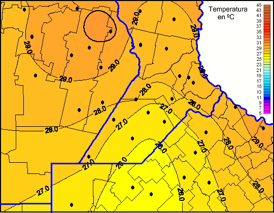Mapa de temperaturas máximas de las las últimas 96 horas.(Desde las 8:00AM hasta las 8:00AM). Se actualiza a las 10:00hs.