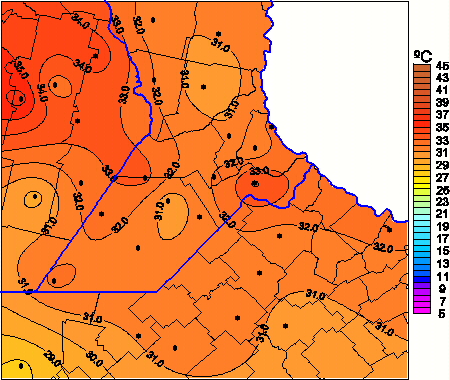 Mapa de temperaturas máximas de las las últimas 72 horas.(Desde las 8:00AM hasta las 8:00AM). Se actualiza a las 10:00hs.