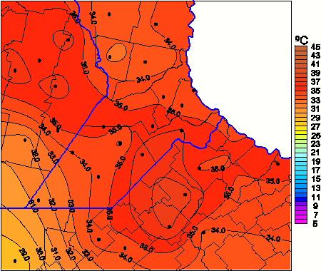 Mapa de temperaturas máximas de las las últimas 96 horas.(Desde las 8:00AM hasta las 8:00AM). Se actualiza a las 10:00hs.