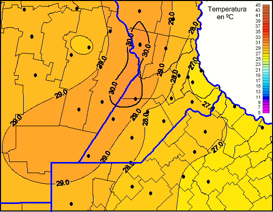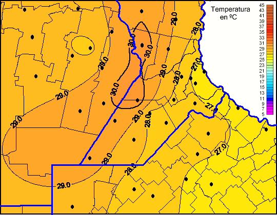 Mapa de temperaturas máximas de las las últimas 72 horas.(Desde las 8:00AM hasta las 8:00AM). Se actualiza a las 10:00hs.