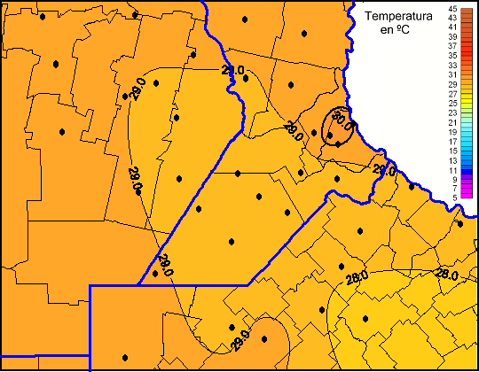 Mapa de temperaturas máximas de las las últimas 96 horas.(Desde las 8:00AM hasta las 8:00AM). Se actualiza a las 10:00hs.