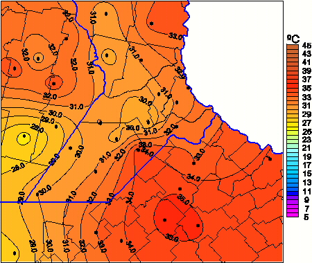 Mapa de temperaturas máximas de las las últimas 72 horas.(Desde las 8:00AM hasta las 8:00AM). Se actualiza a las 10:00hs.