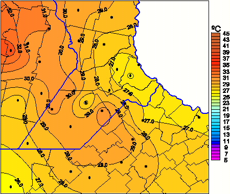 Mapa de temperaturas máximas de las las últimas 96 horas.(Desde las 8:00AM hasta las 8:00AM). Se actualiza a las 10:00hs.