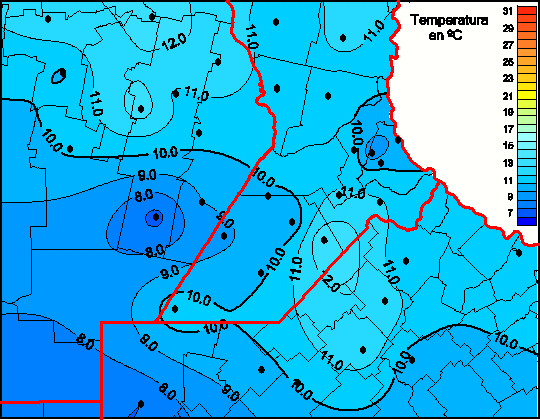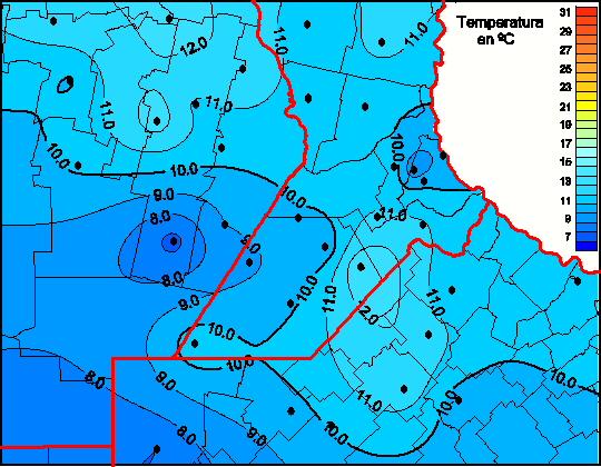 Mapa de temperaturas medias de las las últimas 48 horas.(Desde las 8:00AM hasta las 8:00AM). Se actualiza a las 10:00hs.