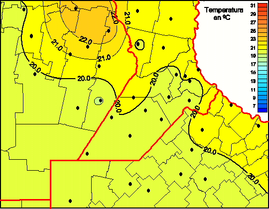 Mapa de temperaturas medias de las las últimas 48 horas.(Desde las 8:00AM hasta las 8:00AM). Se actualiza a las 10:00hs.