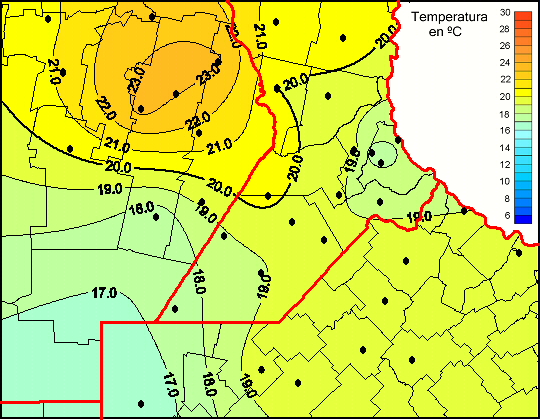 Mapa de temperaturas medias de las las últimas 48 horas.(Desde las 8:00AM hasta las 8:00AM). Se actualiza a las 10:00hs.