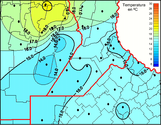 Mapa de temperaturas medias de las las últimas 96 horas.(Desde las 8:00AM hasta las 8:00AM). Se actualiza a las 10:00hs.