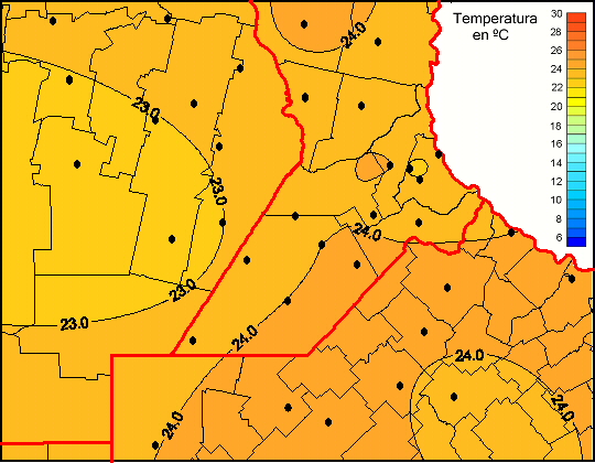 Mapa de temperaturas medias de las las últimas 96 horas.(Desde las 8:00AM hasta las 8:00AM). Se actualiza a las 10:00hs.