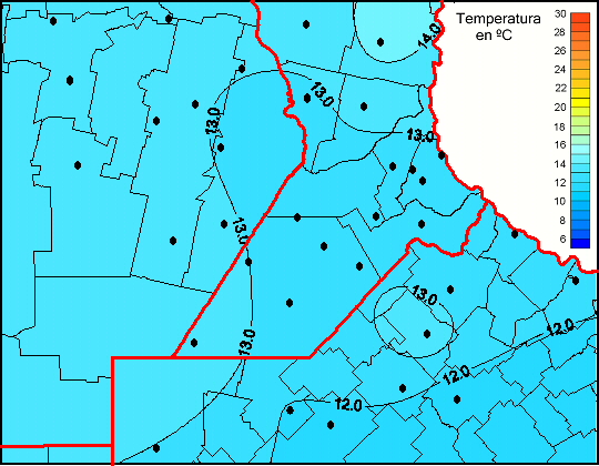 Mapa de temperaturas medias de las las últimas 96 horas.(Desde las 8:00AM hasta las 8:00AM). Se actualiza a las 10:00hs.
