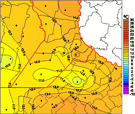 Mapa de temperaturas medias de las las últimas 96 horas.(Desde las 8:00AM hasta las 8:00AM). Se actualiza a las 10:00hs.