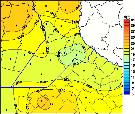 Mapa de temperaturas medias de las las últimas 48 horas.(Desde las 8:00AM hasta las 8:00AM). Se actualiza a las 10:00hs.